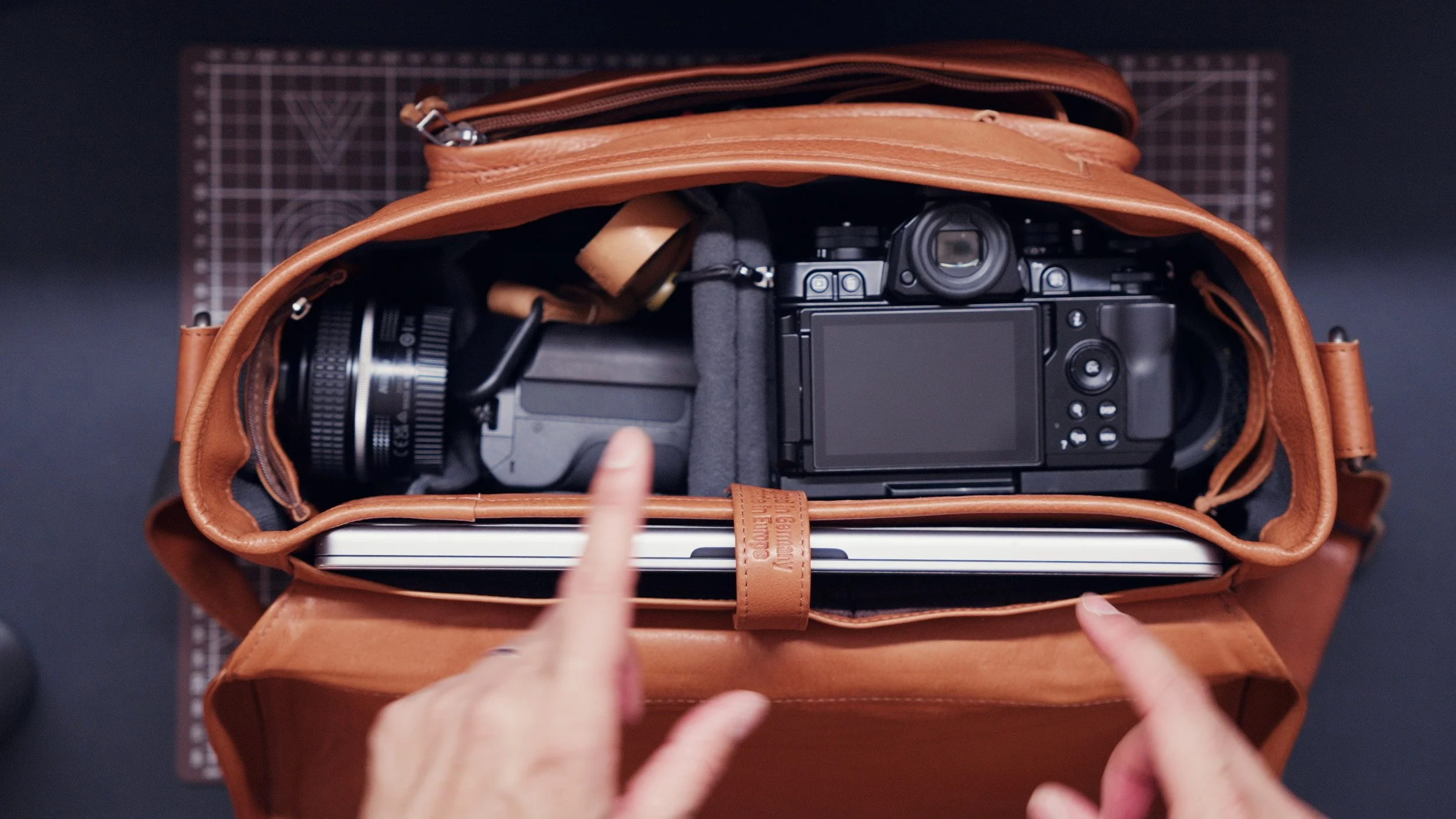 This bag's top flap isn't too thick, and the shoulder strap has a nylon backing. That’s how they made the weight manageable despite using full-grain leather. It fits everything I need for work in a very structured way including: