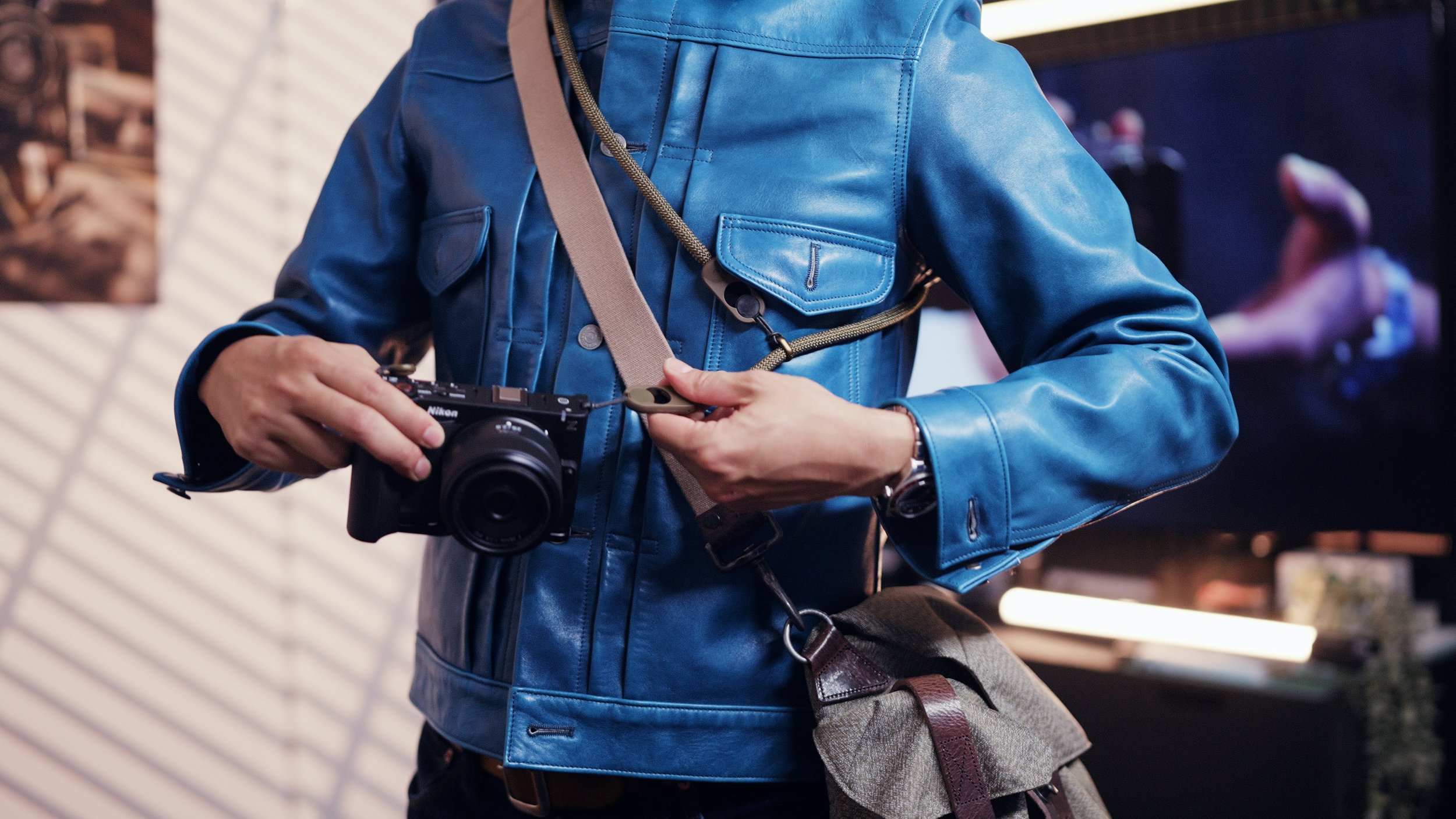 This lets me wear the strap on my body without a camera attached, OR just attach the ZR via one anchor. It’s pretty stable, the strap doesn’t block any controls, though this is a hack. I don’t think the leash is supposed to be used like this, their form rope strap is.
